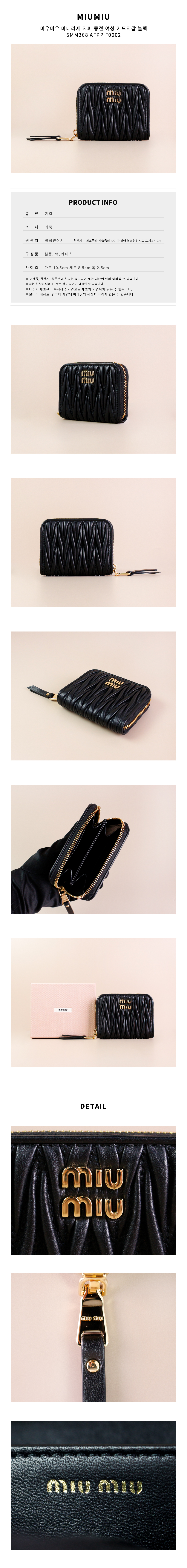 | 상품명 / 모델명 | 미우미우 마테라세 지퍼 동전 여성 카드지갑 블랙 5MM268 AFPP F0002 [여주아울렛] / 5MM268 AFPP F0002 |
