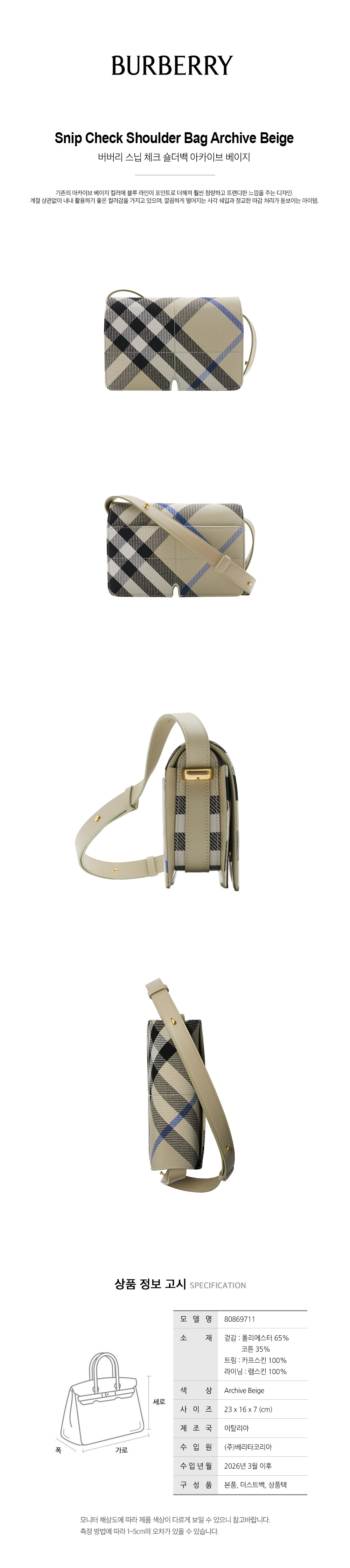 버버리 버버리 스닙 체크 숄더백 아카이브 베이지 80869711